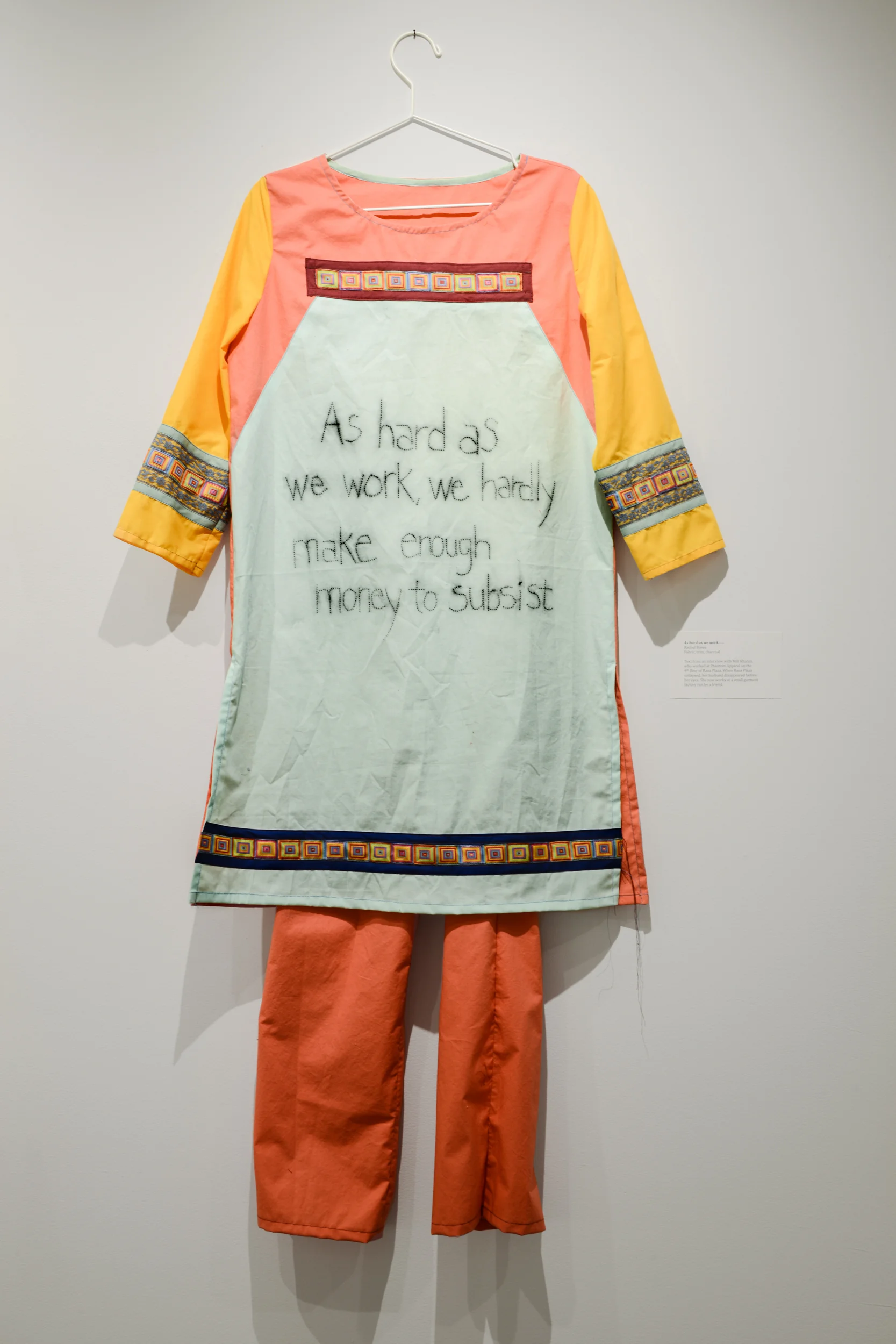 The Garment Solidarity Project expresses solidarity and empathy with garment workers around the world through the metaphoric act of sewing clothes for the women who sew our clothes. By sewing the common clothing of Bangladeshi garment workers, the shalwar kameez, in public, I aim to convey an act of solidarity with these workers. I also hope to raise critical questions about how our clothes are made. By creating an interactive, temporary art installation in public, the “making” process becomes an act of connection with garment workers in Bangladesh, and embeds questions about how our clothes are made into the finished works.